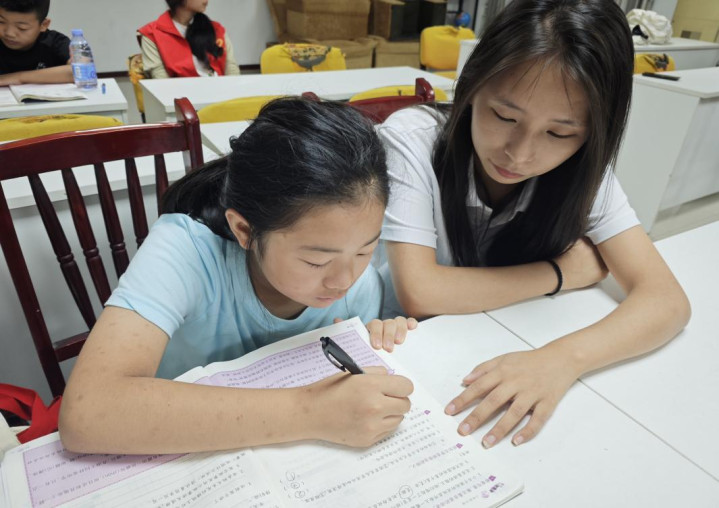“老师,‘璀璨’的‘璀’怎么写?”“姐姐,这篇作文我想写爷爷,但不知道怎么开头。”实践团成员们穿梭在课桌间,时而弯腰讲解题目,时而坐在孩子身边逐字修改作文,时而拿起彩笔在错题旁画个笑脸提醒。