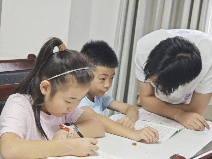 三年级的宇航小朋友遇到了一道“鸡兔同笼”的数学题,抓着头发愁眉不展。实践团成员毛志林没有直接给出答案,而是拿出草稿纸画起了简笔画,轻声讲解:“你看,我们把兔子当成‘长了四条腿的小鸡’,先算所有动物都有两条腿的话一共多少腿,多出来的就是兔子的‘额外腿’啦……”他边画边讲,宇航小朋友的眉头渐渐舒展,算出答案时,猛地举起手,眼里闪着光亮:“我会了!就像分糖果一样,先算清楚总数再分配!”。