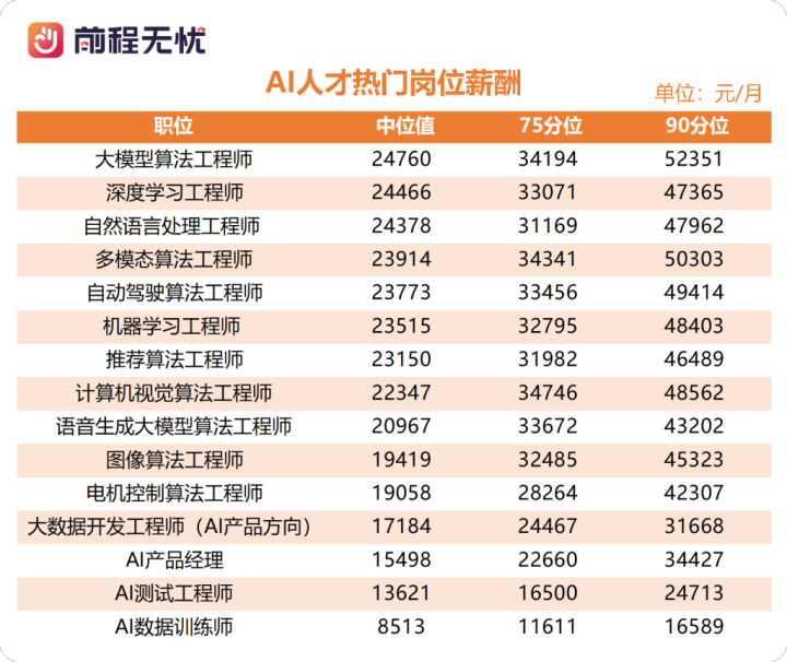 在大模型浪潮下,AI技术研发类岗位薪酬中位值较高:大模型算法工程师以24760元/月的中位薪酬领跑,深度学习工程师(24466元/月)和自然语言处理工程师(24378元/月)紧随其后;多模态算法工程师、自动驾驶算法工程师、机器学习工程师、推荐算法工程师薪酬中位值均超过23000元/月;而支持性岗位如AI测试工程师(13621元/月)和AI数据训练师(8513元/月)与核心技术岗位薪资存在显著差距。(澎湃新闻记者秦盛)